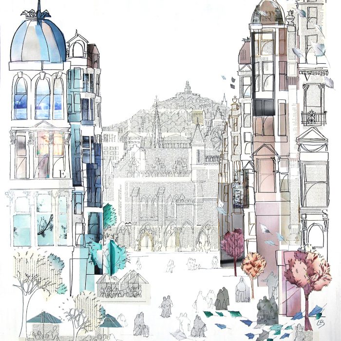 Linda Brownlee trained at Glasgow School of Art, qualifying in Textile Design in 1980 before taking up a career in nursing. After 38 years in the health service she returned fulltime to her passion for drawing, and visits to Barcelona developed an interest in capturing street scenes using pen and collage.