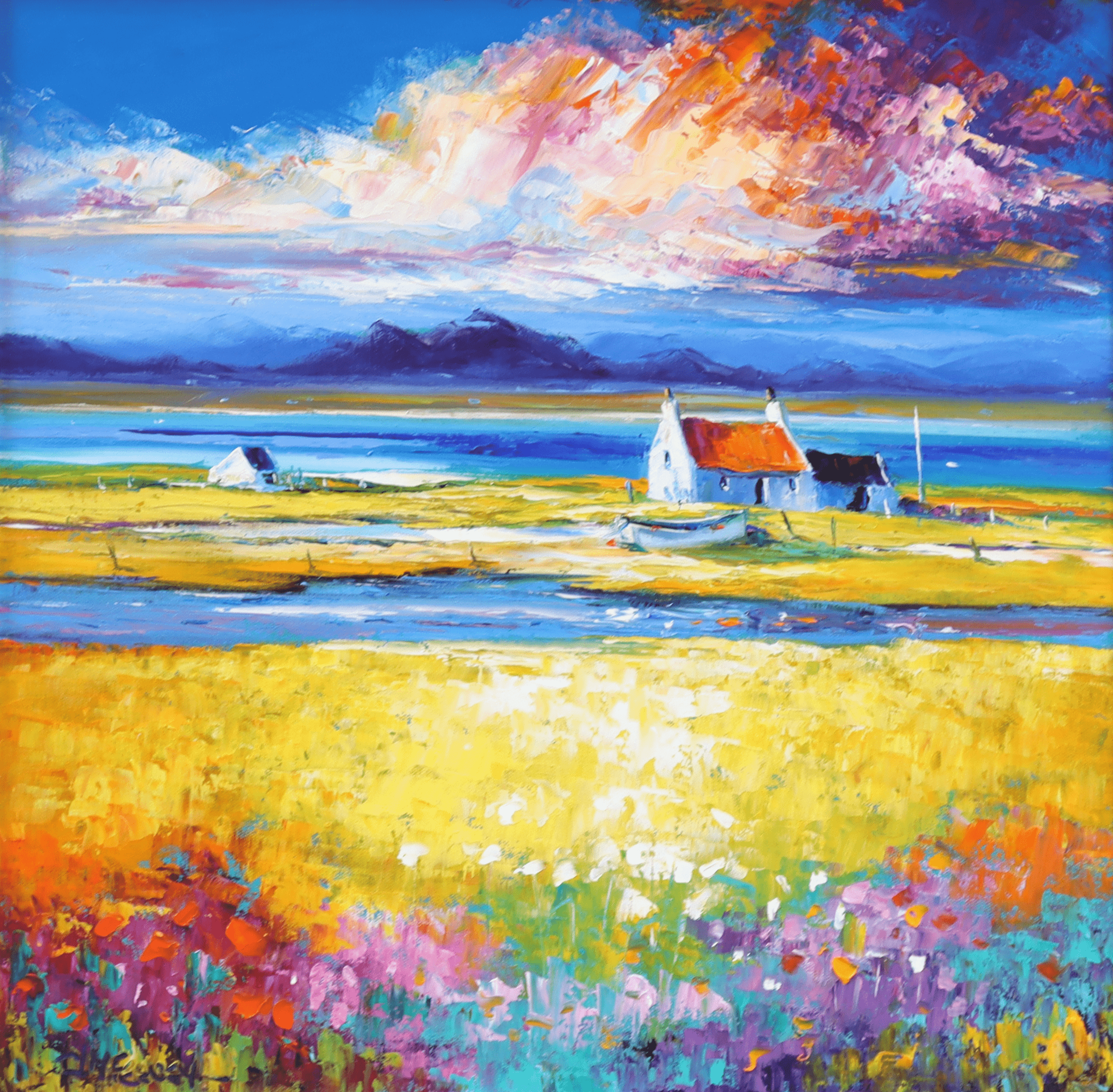 With her exuberant broad brush technique, Jean balances a keen eye for detail with sculptural application. She finds constant inspiration from the remote and rugged landscapes , harbours and coastal areas, and lists her influences as the Scottish Colourists and German Expressionists and, of course Van Gogh!