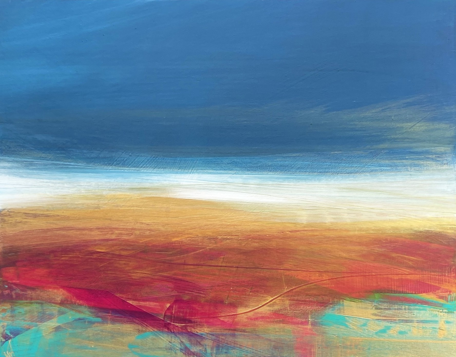 Her paintings evoke a deep sense of openness and calm, yet through expressive brushstrokes, rich textures, and bold colour contrasts, she captures the fleeting intensity of stormy skies and golden bursts of sunlight.